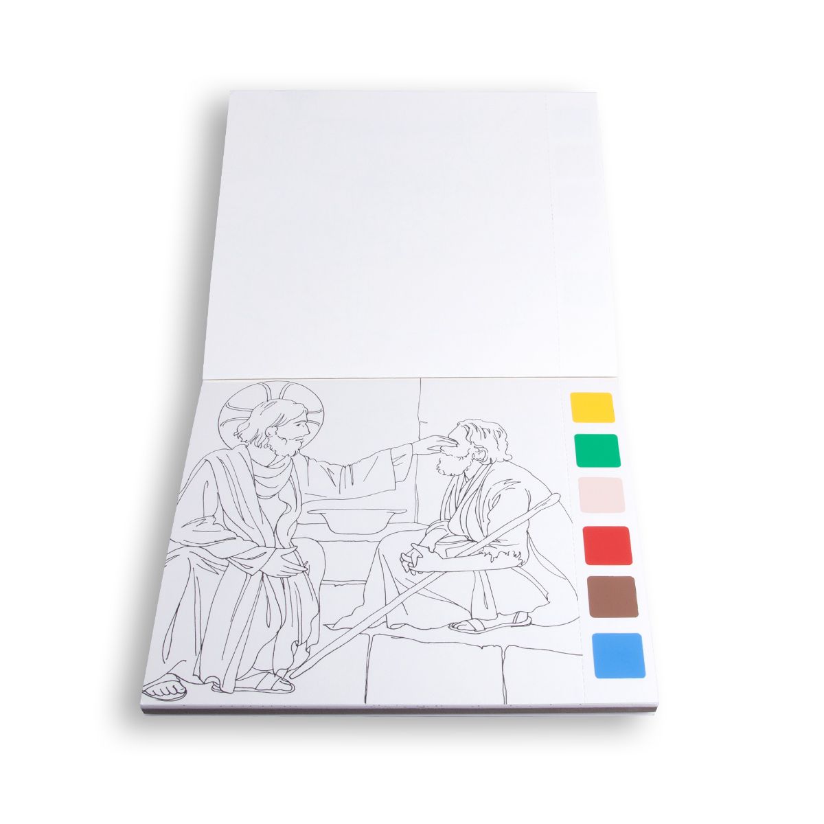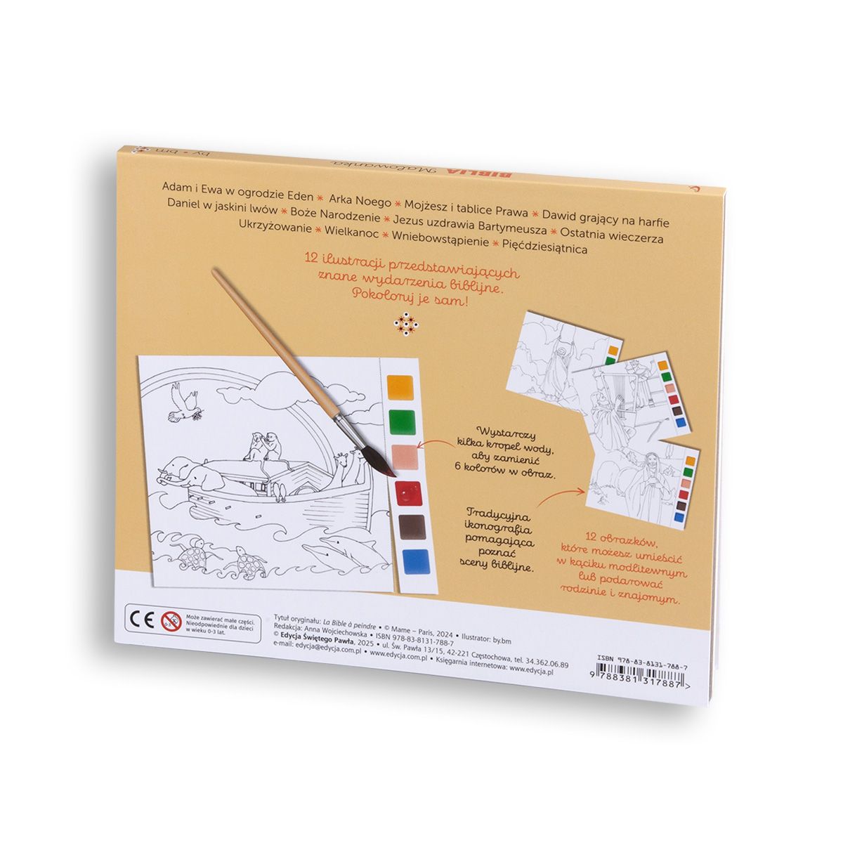 Malowanki, pędzelek i zestaw farbek to propozycja dla małych artystów! Ciekawa tematyka, tradycyjna ikonografia i znane wydarzenia biblijne, takie jak np. Arka Noego czy Boże Narodzenie pewnością zainteresują najmłodszych. Dołączony zestaw 6 kolorów farbek i pędzelek sprawia, że wystarczy odrobina wody i można zacząć zabawę w kolorowanie.
