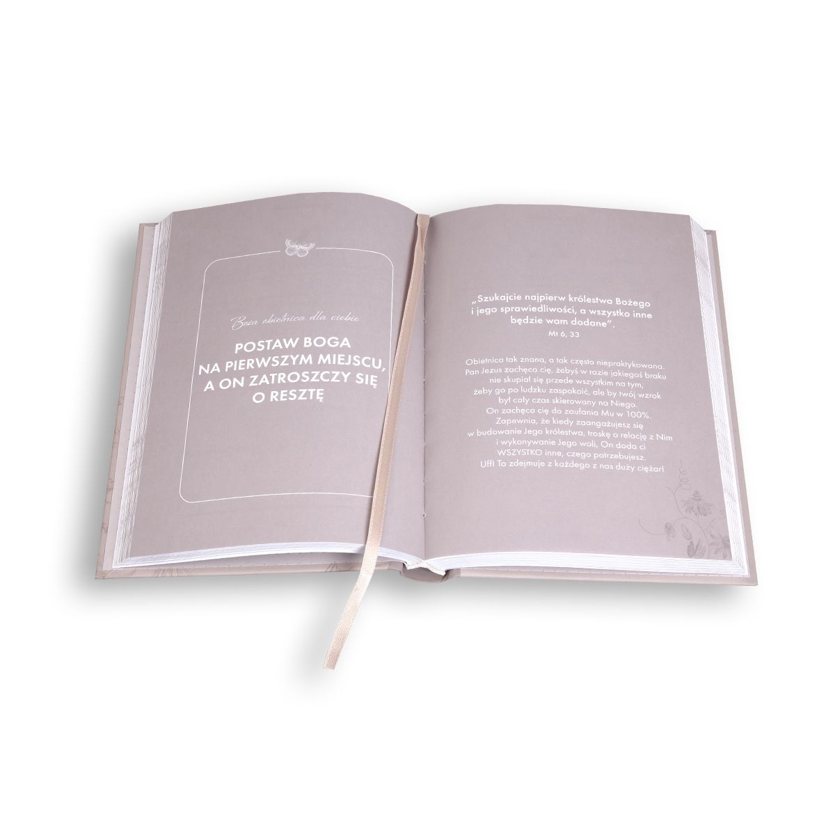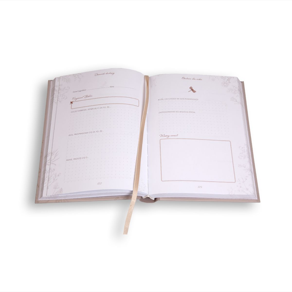 Dziennik posiada twardą oprawę z gumką w gustownych odcieniach beżu z subtelnymi, kwiatowymi motywami. Całość utrzymano w zachwycającej szacie graficznej, by rozważanie Słowa Bożego stało się wyjątkowym przeżyciem – każdego dnia!
