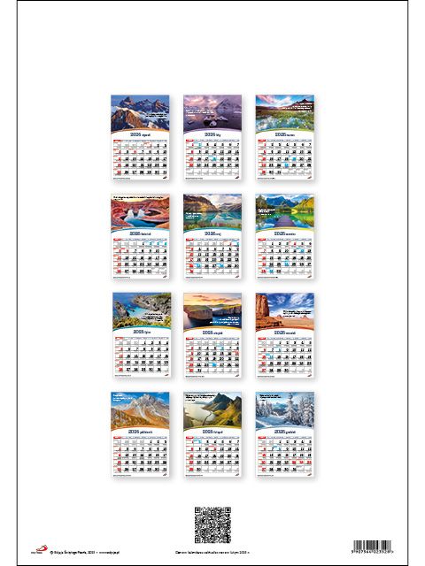Papier kredowy, 6 kartek i okładka, oprawa spiralowa z wygodną zawieszką, ciekawe zdjęcia i DUŻE kolorowe kalendarium z zaznaczonymi imieninami i świętami, oraz myśl na każdy miesiąc.