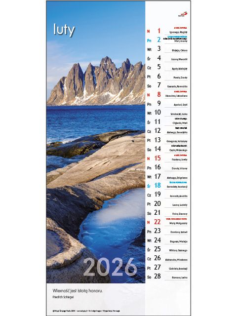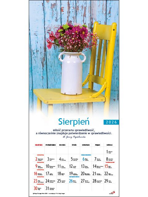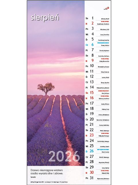 Kalendarz ścienny na rok 2026 zilustrowany pięknymi zdjęciami .Wykonany z wysokiej jakości papieru kredowego, wzbogacony o kolorowe kalendarium z zaznaczonymi imieninami i świętami, myślą na każdy miesiąc. Oprawa spiralowana z zawieszką.