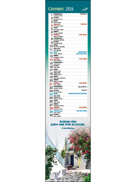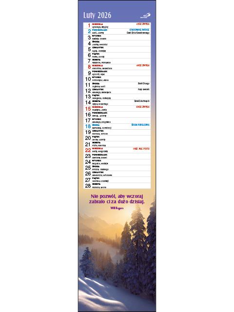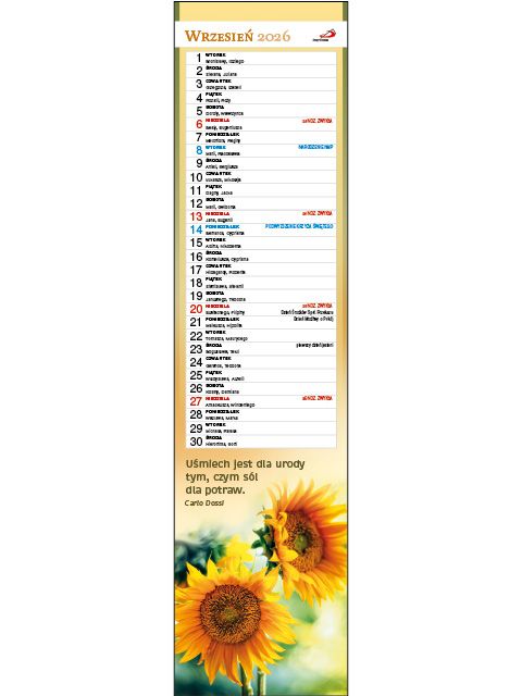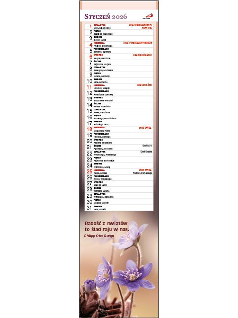 Kalendarz ścienny na rok 2026 zilustrowany pięknymi fotografiami. Wykonany z wysokiej jakości papieru kredowego, wzbogacony o kolorowe kalendarium z zaznaczonymi imieninami i świętami. Inspirująca myśl na każdy miesiąc.