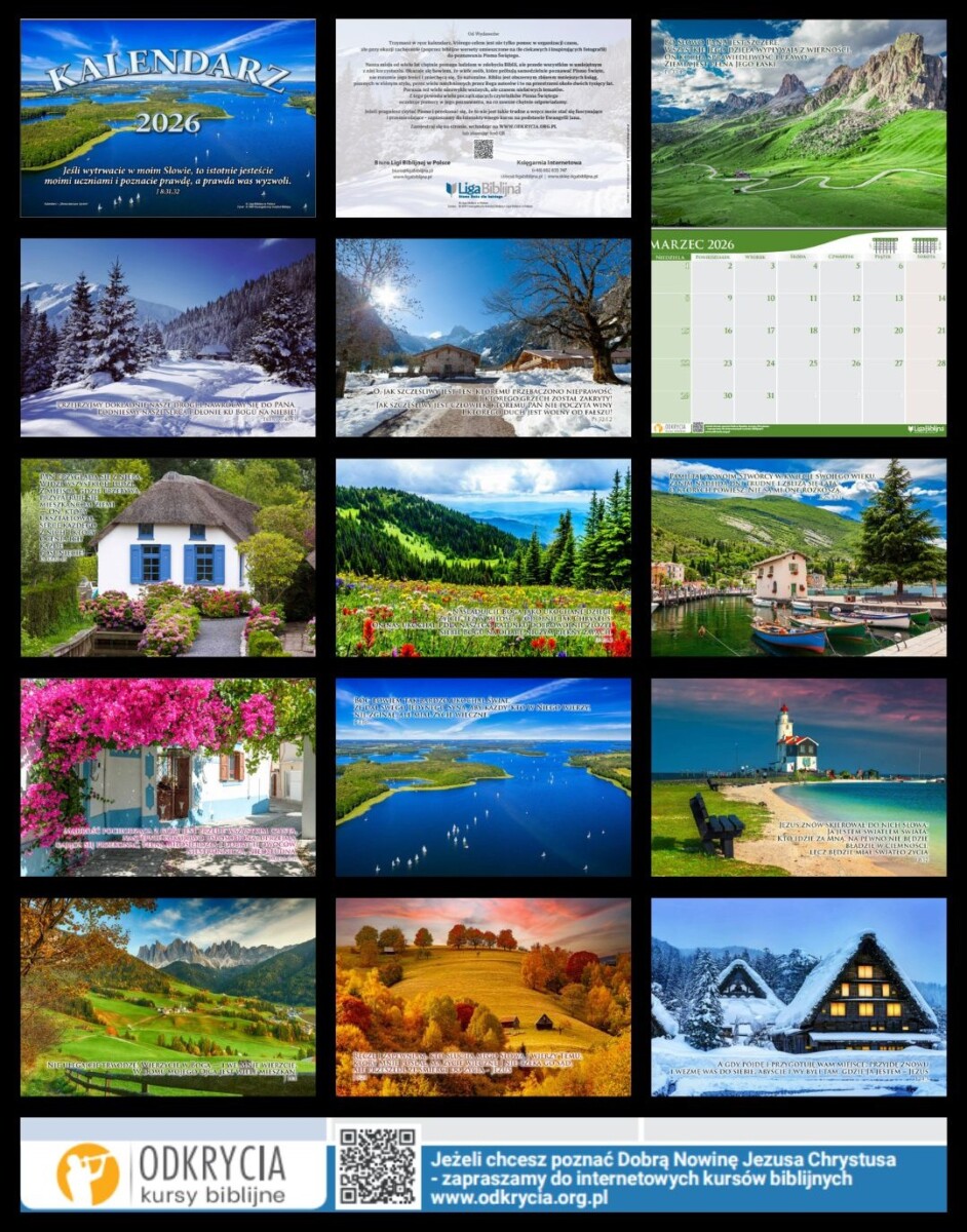 Kalendarz ścienny “SŁOWA DARZĄCE ŻYCIEM” z krajobrazami i wersetami z Pisma Świętego.