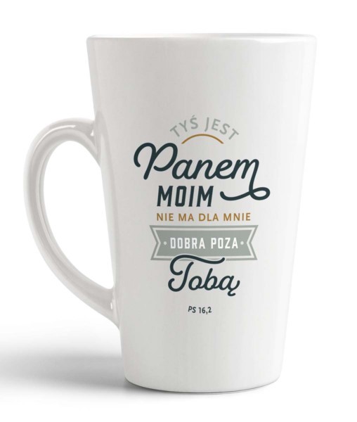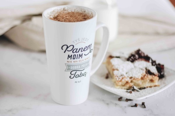 Kubek ceramiczny z wersetem lub tekstem opartym o wartości chrześcijańskie.