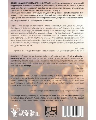 Z niezwykłą wnikliwością i przy użyciu żywych ilustracji pastor i doradca małżeński Tim Savage pomaga nam uświadomić sobie nieograniczony potencjał małżeństwa i odkryć, w jaki sposób Boża chwała może przeniknąć nasze relacje, zwiększyć naszą radość i uczynić nas jasnym światłem w świecie pełnym problemów.