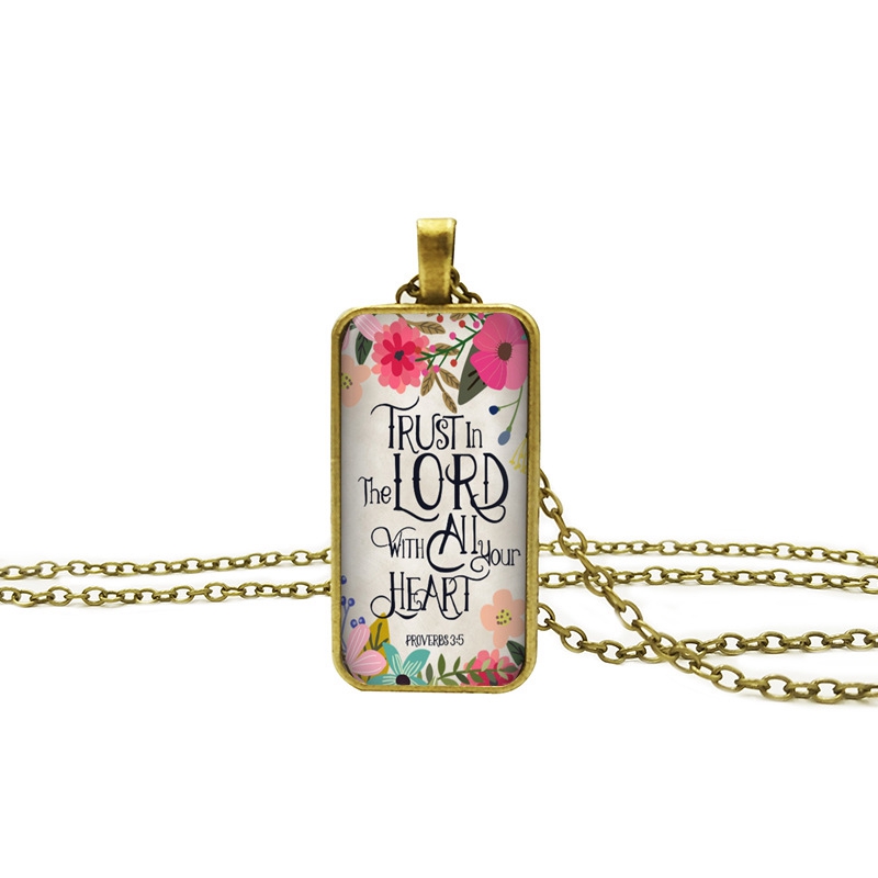 Metalowy naszyjnik z zawieszką z wersetem biblijnym w języku angielskim. „Trust in the Lord with all your heart”