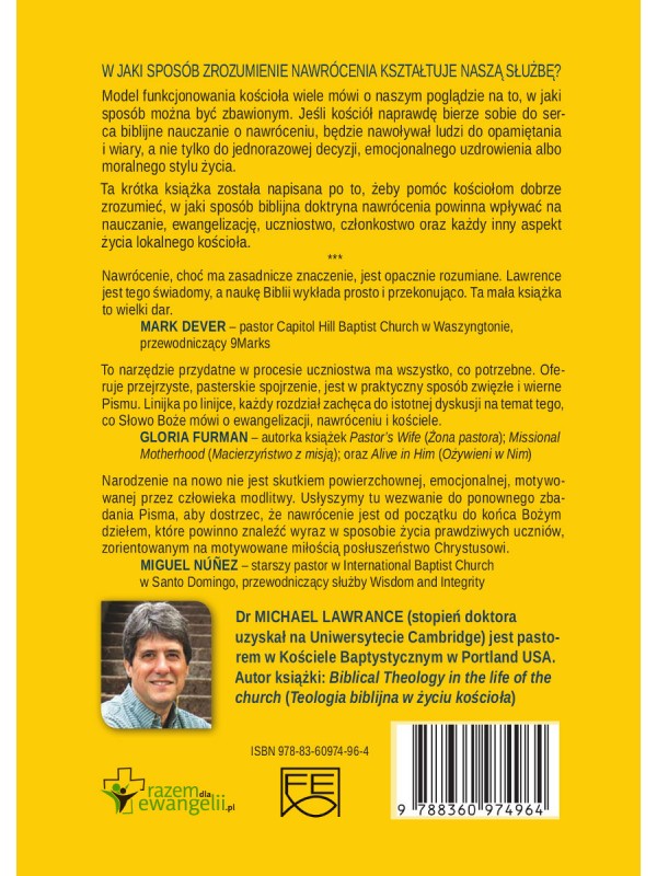 W tej ważnej książce Michael Lawrence przejrzyście ukazuje zarys biblijnej teologii nawrócenia. Nie sugeruje, że nawrócenie zmienia ludzi w milszych, bo można być miłym i nienawróco­nym. Z drugiej strony, nawrócenie nie jest tylko subiektywnym doświadczeniem, gdyż można czuć się nawróconym, a wcale ta­kim nie być. Lawrence dowodzi, że nawrócenie jest aktem, który zaczyna się od Boga (odrodzenie) i przynosi owoc w człowieku (upamiętanie i wiara). Ten przepływ Bożej łaski pozwala nam nie tylko upamiętać się i uwierzyć, ale też włącza nas w Boży lud stworzony przez Niego w Chrystusie Jezusie. Krótko mówiąc, na­wrócenie prowadzi w efekcie do członkostwa w lokalnym koście­le. Z całego serca polecam tę książkę.