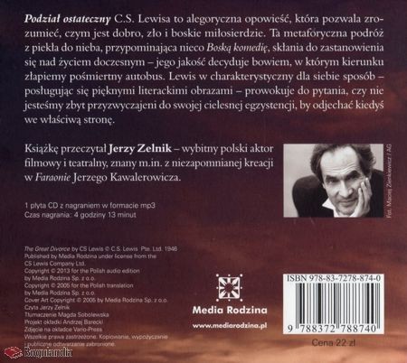 „Podział ostateczny” C.S. Lewisa to alegoryczna opowieść, która pozwala zrozumieć, czym jest dobro, zło i boskie miłosierdzie. Ta metaforyczna podróż z piekła do nieba, przypominająca nieco „Boską komedię”, skłania do zastanowienia się nad życiem doczesnym – jego jakość decyduje bowiem, w którym kierunku złapiemy pośmiertny autobus. Lewis w charakterystyczny dla siebie sposób – posługując się pięknymi literackimi obrazami – prowokuje do pytania, czy nie jesteśmy zbyt przyzwyczajeni do swojej cielesnej egzystencji, by odjechać kiedyś we właściwą stronę.