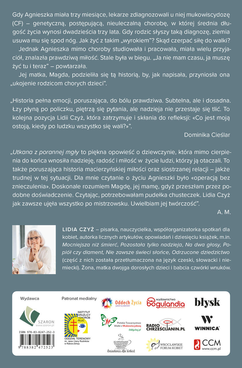 „Utkana z porannej mgły to piękna opowieść o dziewczynie, która mimo cierpienia do końca wnosiła nadzieję, radość i miłość w życie ludzi, którzy ją otaczali. To także poruszająca historia macierzyńskiej miłości oraz siostrzanej relacji – jakże trudnej w tej sytuacji. Dla mnie czytanie o życiu Agnieszki było «operacją bez znieczulenia». Doskonale rozumiem Magdę, jej mamę, gdyż przeszłam przez podobne doświadczenie. Czytając, potrzebowałam pudełka chusteczek. Lidia Czyż jak zawsze ujęła wszystko po mistrzowsku. Uwielbiam jej twórczość”.