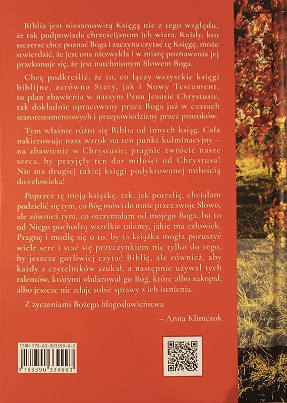 Poprzez tę moją książkę, tak, jak potrafię, chciałam podzielić się tym, co Bóg mówi do mnie przez swoje Słowo, ale również tym, co otrzymałam od mojego Boga, bo to od Niego pochodzą wszystkie talenty, jakie ma człowiek. Pragnę i modlę się o to, by ta książka mogła poruszyć wiele serc i stać się przyczynkiem nie tylko do tego, by jeszcze gorliwiej czytać Biblię, ale również, aby każdy z czytelników szukał, a następnie używał tych talentów,którymi obdarował go Bóg, które albo zakopał, albo jeszcze nie zdaje sobie sprawy z ich istnienia.