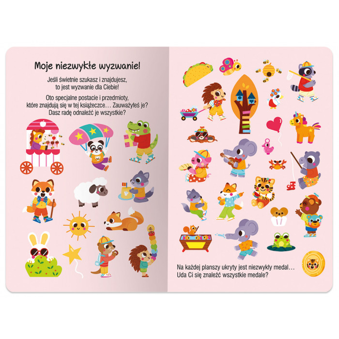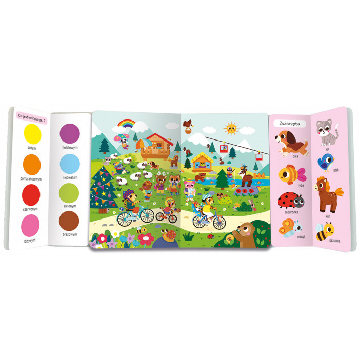 Baw się bez końca w szukanie i znajdowanie! Każdy maluch przekona się, jak wiele możliwości zabawy jest w tej potrójnej książce! W środkowej części znajdują się zabawne, kolorowe scenki z przejażdżki rowerowej. Dwie książeczki po bokach proponują różne elementy do znalezienia, między innymi kolory, kształty, liczby, zwierzęta.Co ciekawe, każdy element z bocznych książeczek można wyszukać na dowolnej scence! To daje mnóstwo możliwości przeróżnych odkryć. Dobrej zabawy!